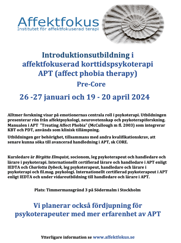 Introduktionsutbildning i affektfokuserad korttidspsykoterapi APT (affect phobia therapy) För anmälan eller kontakt med kursarrangören, vänligen gå till www.affektfokus.se Dela det här: Klicka för att dela på X (Öppnas i ett nytt fönster) X Klicka för att dela på Facebook (Öppnas i ett nytt fönster) Facebook Klicka för utskrift (Öppnas i ett nytt fönster) Skriv ut Gilla Laddar in … Relaterade Lämna en kommentar Avbryt svar Δ